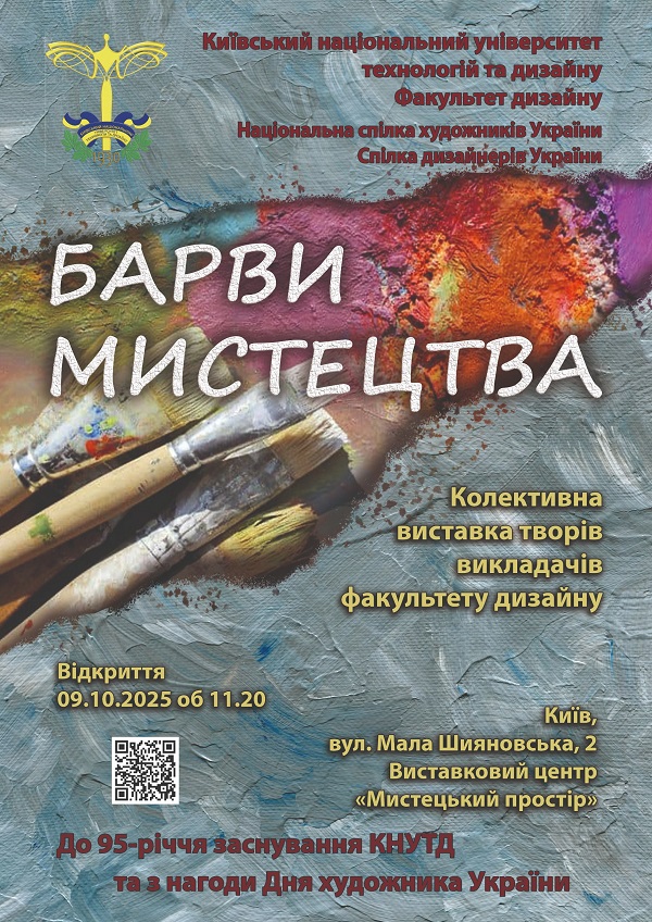 COLLECTIVE EXHIBITION OF LECTURERS OF THE FACULTY OF DESIGN KNUTD "COLORS OF ART" 09.10–30.10.2025 Opening on October 9, 2025 at 11:20 in the Exhibition center of KNUTD "Art Space". The exhibition center "Art Space KNUTD" presents a collective exhibition of teachers of the faculty of design, KNUTD "COLORS OF ART", dedicated to the Artist's Day and the 95th anniversary of the founding of the KNUTD. The exhibition "COLORS OF ART" impresses with the variety of styles, genres and bright colors and presents more than 20 thematic paintings created by artists teaching at KNUTD. Among the participants of the exhibition are both famous artists, members of the National Union of Artists of Ukraine, the Union of Designers of Ukraine, and young talents who are just beginning their creative path. The Faculty of Design of KNUTD has been teaching and training specialists in various fields of design for more than 25 years. Designers are artists who create not only in the realm of practice, but also in aesthetics, so the artistic component of designer training is extremely important. That is why the lecturers of the Faculty of Design of KNUTD have artistic training and work in various techniques: painting, graphics, watercolor, pastel technique, etc. |