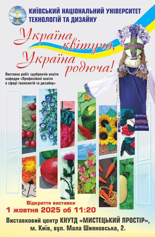 PETD DEPARTMENT EXHIBITION: "FLOURISHING UKRAINE, FERTILE UKRAINE!" 01.10–05.10.2025 On October 1st, the Kyiv National University of Technologies and Design hosted the opening of the exhibition "Fertile Ukraine, Flourishing Ukraine!" The exhibition was prepared by students of the Department of Professional Education in Technologies and Design (PETD). The exposition featured a series of decorative panels created by students using fabric, leather, and papier-mâché. Each piece symbolizes love for the native land, its beauty, strength, and generosity. At the heart of the exhibition are images embodying the soul of Ukraine: poppies and sunflowers, viburnum, cherries, mallow, pumpkin, apple, bindweed, and thistle. Each artwork reflects a unique mood, color palette, and feeling—from the gentle light of summer to deep gratitude for the land that provides life and inspiration. This collection stands as a visual poem about Ukraine—fertile, hardworking, resilient, yet tender and poetic. |