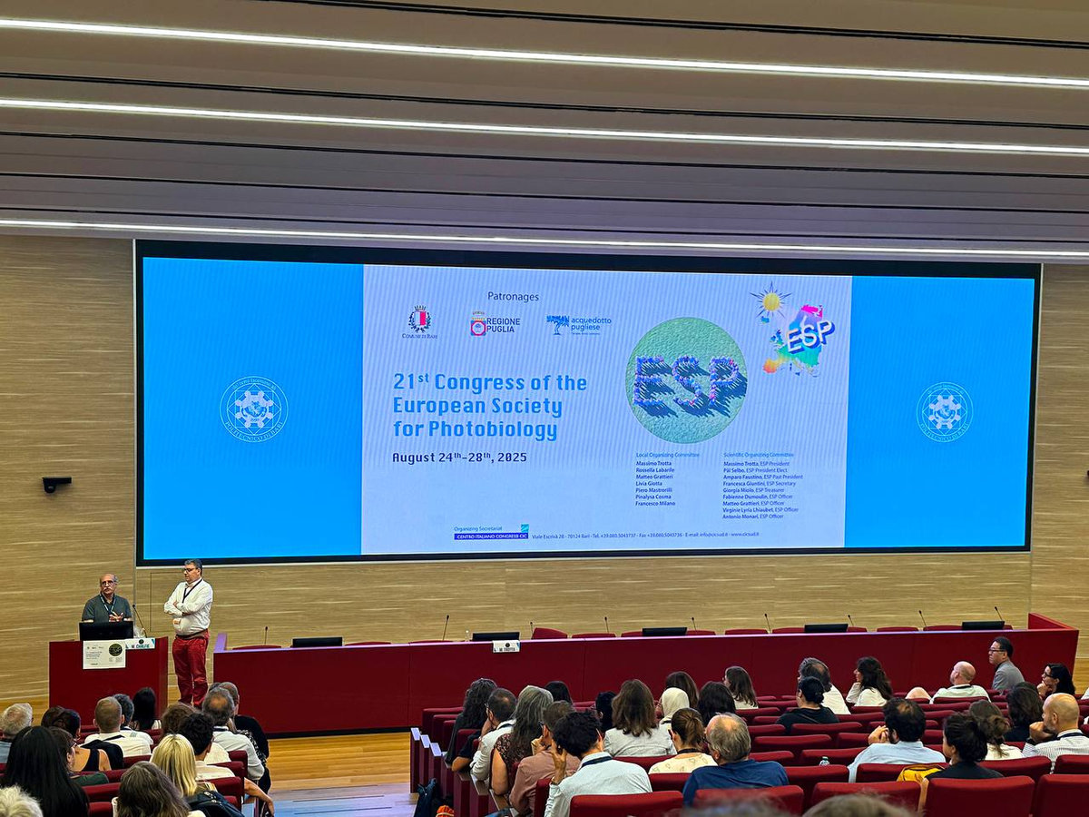 From August 24 to 28, 2025, the 21st Congress of the European Society for Photobiology was held at the Polytechnic University of Bari (Bari, Italy) - one of the most prestigious international scientific forums, which once every two years brings together leading researchers from around the world to present the results of innovative research in the field of photobiology, photoprotection, photochemistry and related sciences. This year, over 500 participants from different countries around the world took part, including well-known scientists, professors and postgraduate students from various universities, as well as representatives of scientific centers and business. The program of the event was very rich and included numerous plenary sessions, oral and poster presentations, and interdisciplinary discussions. The main focus was on phototherapy, photoprotective technologies, mechanisms of photoaging and phototoxicity, nanomaterials research, as well as the development of effective strategies to combat cancer. A special highlight of the event was a lecture by Nobel Prize laureate, american neurobiologist, professor Martin Chalfie.