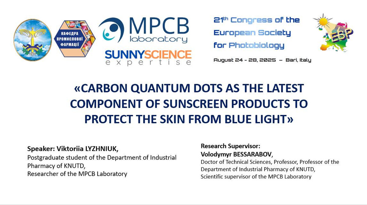 Postgraduate student of the Department of Industrial Pharmacy of the KNUTD, researcher of the Educational and Scientific Laboratory of Molecular Pharmacology, Chemogenomics and Biogerontology (MPCB Lab) Viktoriia LYZHNIUK was the only representative from Ukraine at this congress. On August 25, she successfully delivered an oral report “Carbon quantum dots as the latest component of sunscreen products to protect the skin from blue light”, presenting the results of work on the prospects for using carbon quantum dots in sunscreen cosmetic products to improve their photoprotective properties, in particular, increasing the effectiveness of protection against blue light and increasing the SPF.