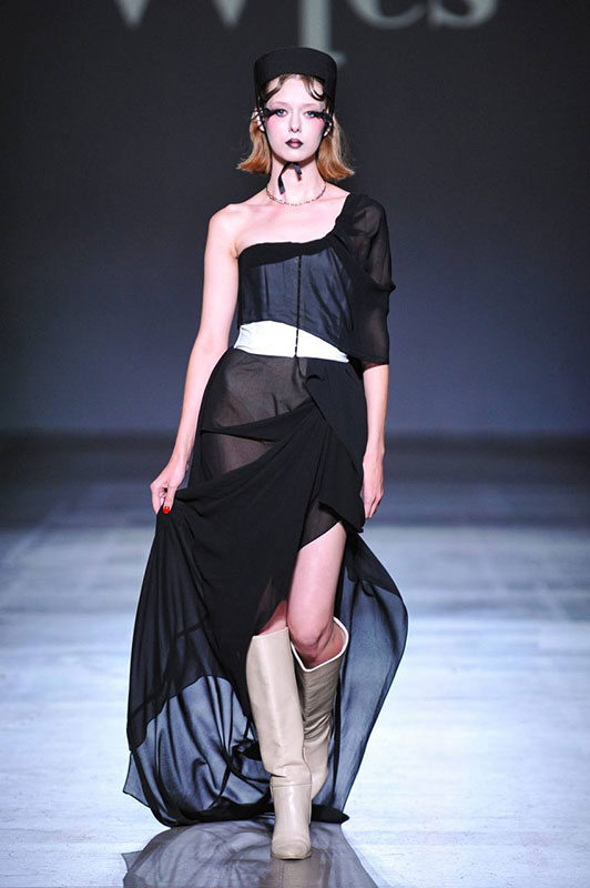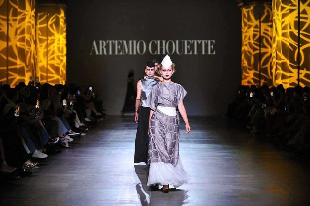 Young designer Artem Pugach (ARTEMIO CHOUETTE brand) presented the collection “Resurrected”, built on an architectural approach to form. Elongated proportions, vertical lines, high collars, voluminous sleeves and accentuated shoulders are the compositional components of the collection. Built on the contrast of dark and light shades, the color scheme combined deep graphite, rich dark brown, chocolate and warm wheat with milky and light gray accents, as well as black and white as an allusion to the combination of light and shadow.
