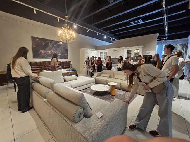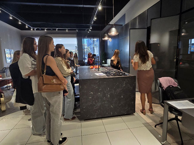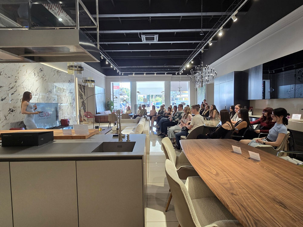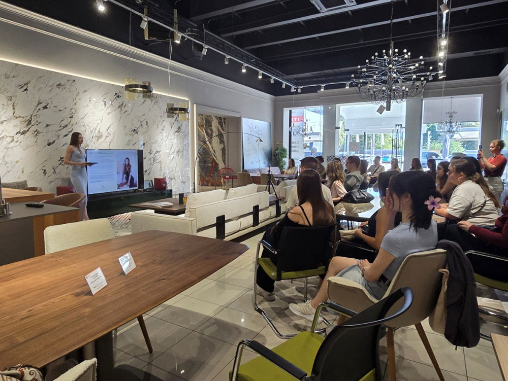 After the lecture, Antonina Vekhteva, Sales and Procurement Manager of FREEDOM, led a tour of the showroom, presenting innovative technologies and materials used in the production of furniture from leading Italian brands. Students had the opportunity to test modern furniture mechanisms, lighting systems, and evaluate textures and the quality of innovative materials.