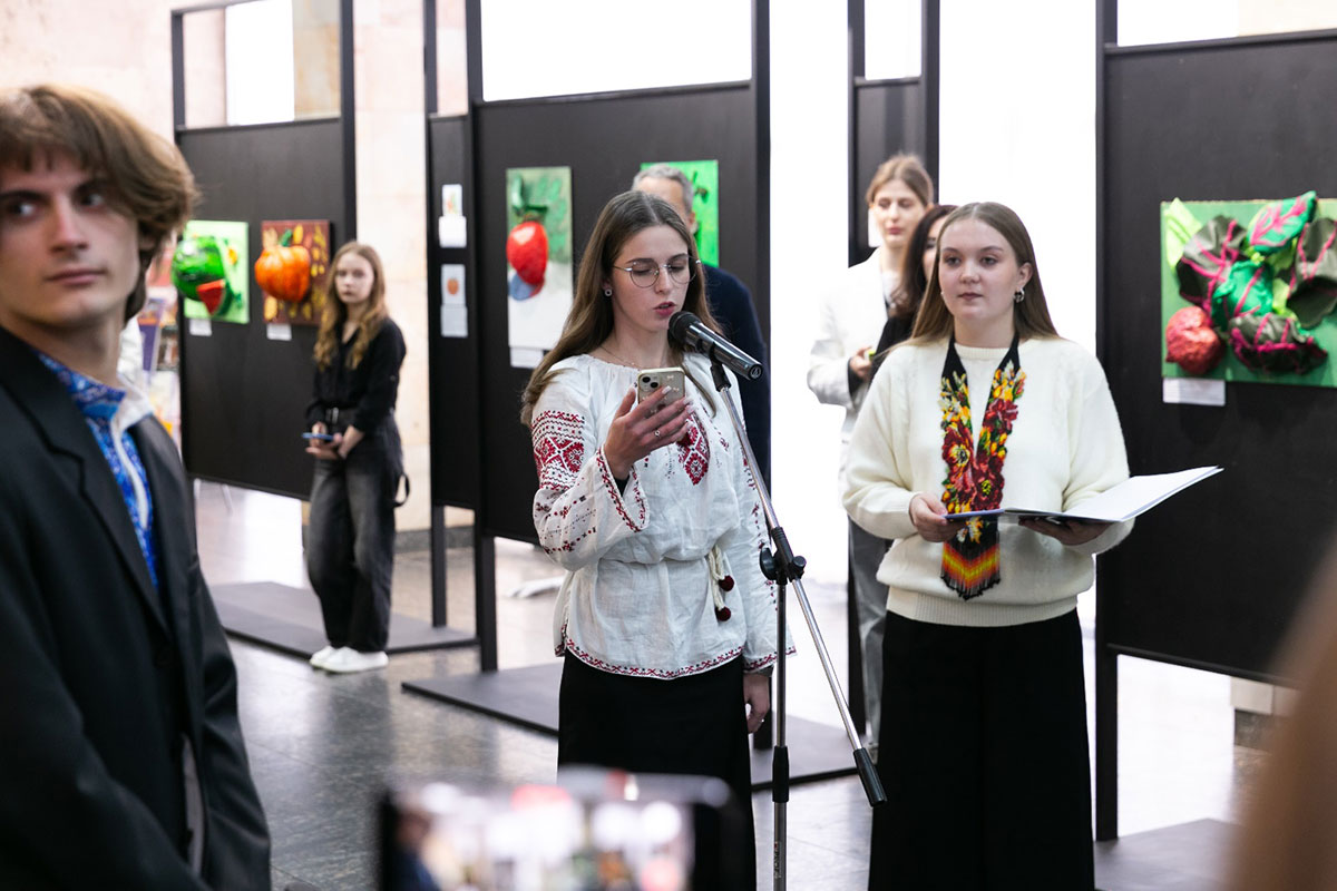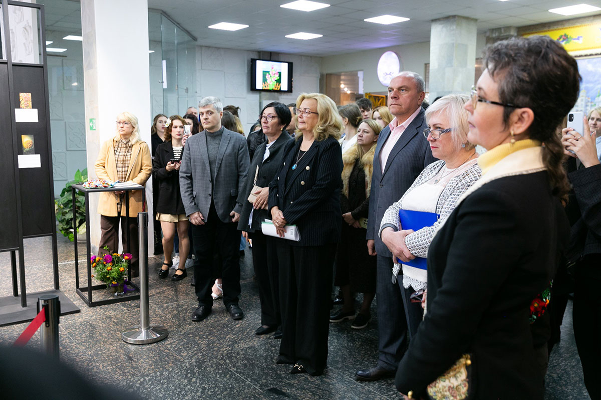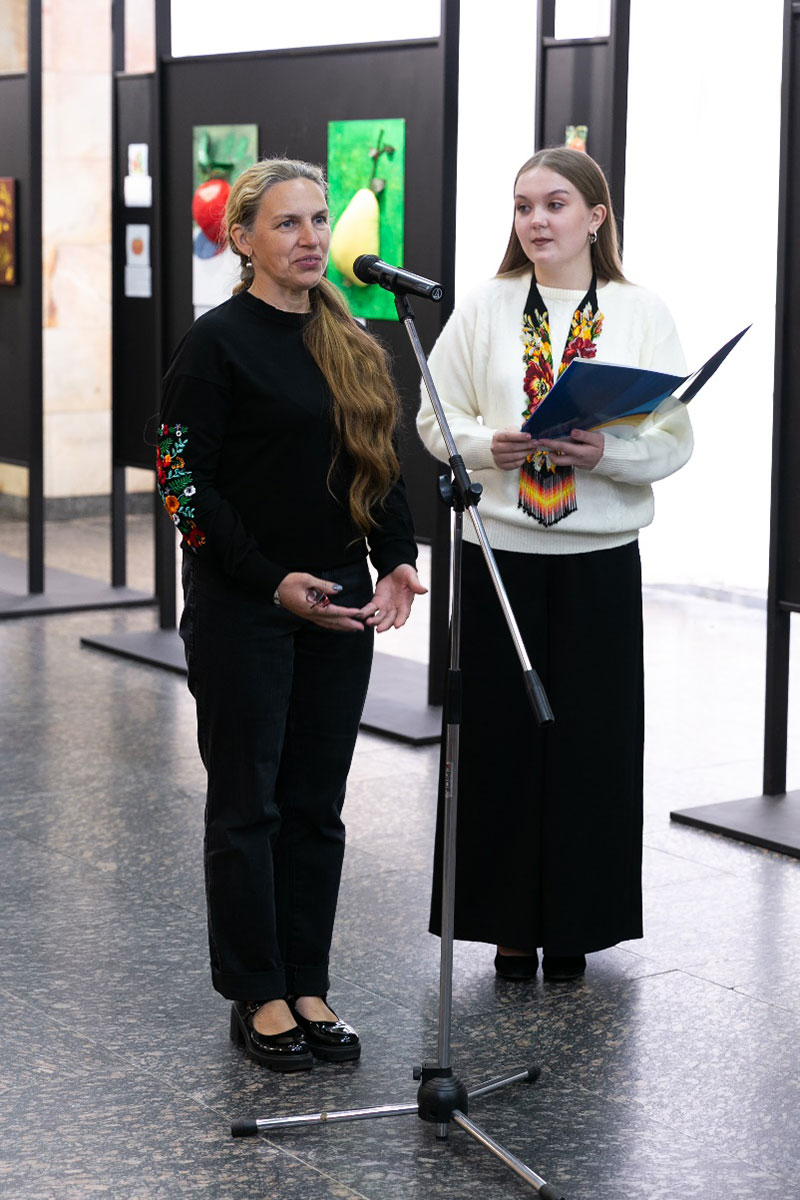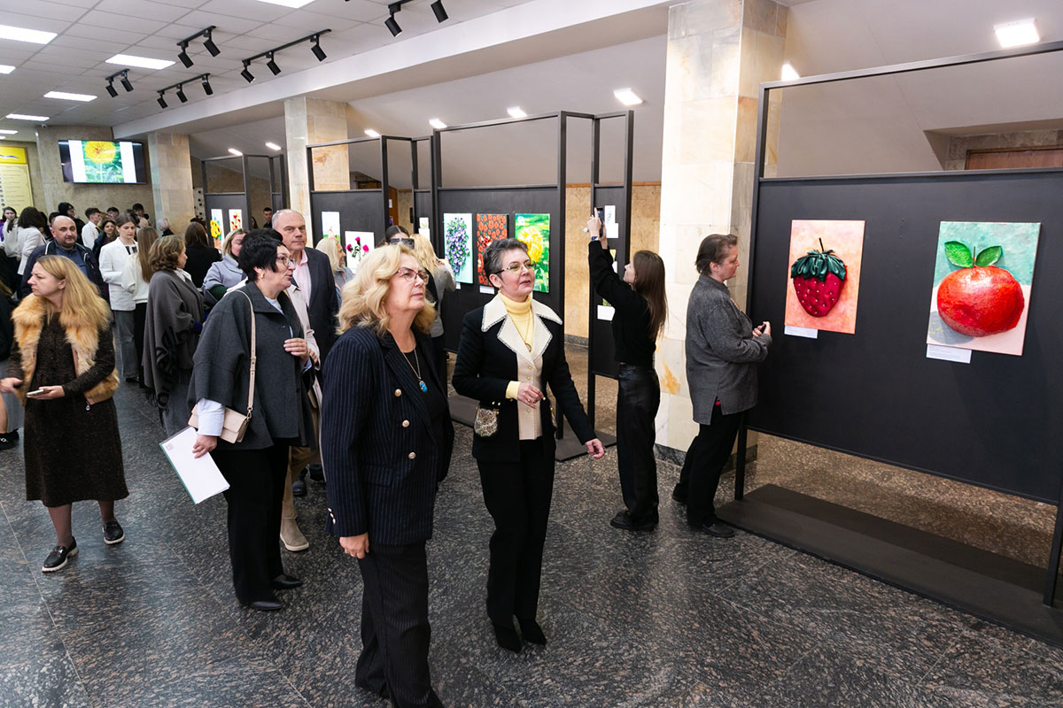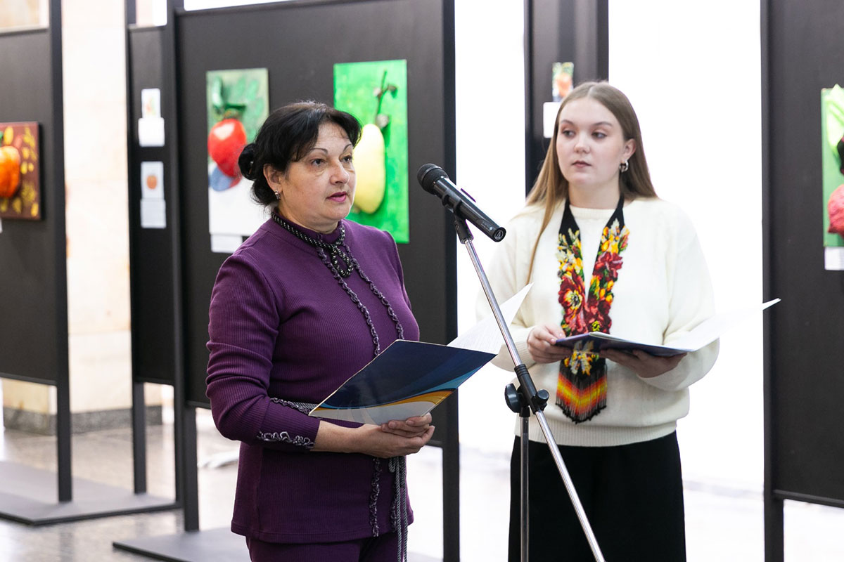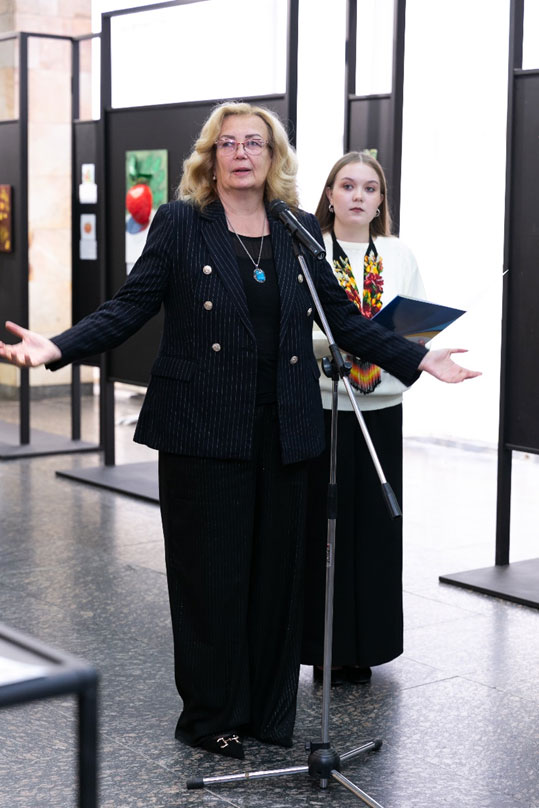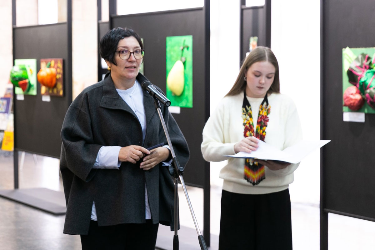 Natalia Ostapenko, Dean of the Faculty of Arts and Fashion, Doctor of Technical Sciences, and Professor, expressed her gratitude to Oleksandra Volodymyrivna for supporting young talents and recognising the importance of nurturing the creativity and abilities of young people. She noted that the bas-relief compositions featuring a multitude of vivid flowers, fruits, and vegetables remind us that life is fleeting, and the most precious gift it offers is time, which never stands still. According to Ms. Ostapenko, the exhibition carries a powerful ideological message and responds to the challenges of our time, “We are different, yet united by love for our native land”. At a moment when every day is a test of the national spirit, the exhibition serves as a manifestation of the creative unity of students and teachers – their reflection on current events, their search for new meanings, and their affirmation of faith in our Victory. At the end of her speech, Ms. Ostapenko wished the young creators beauty and harmony, inspiration, peace, and prosperity.