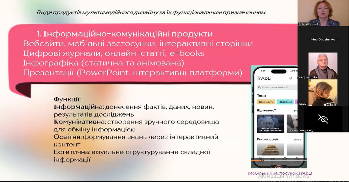 During the lecture, Ruslana Khynevych examined the historical origins of the concept of “multimedia” and the stages of multimedia design development. She characterized the main groups of multimedia products according to their functional purpose. Examples of contemporary practices from the archive of student works of the Department of Multimedia Design were demonstrated for each group.