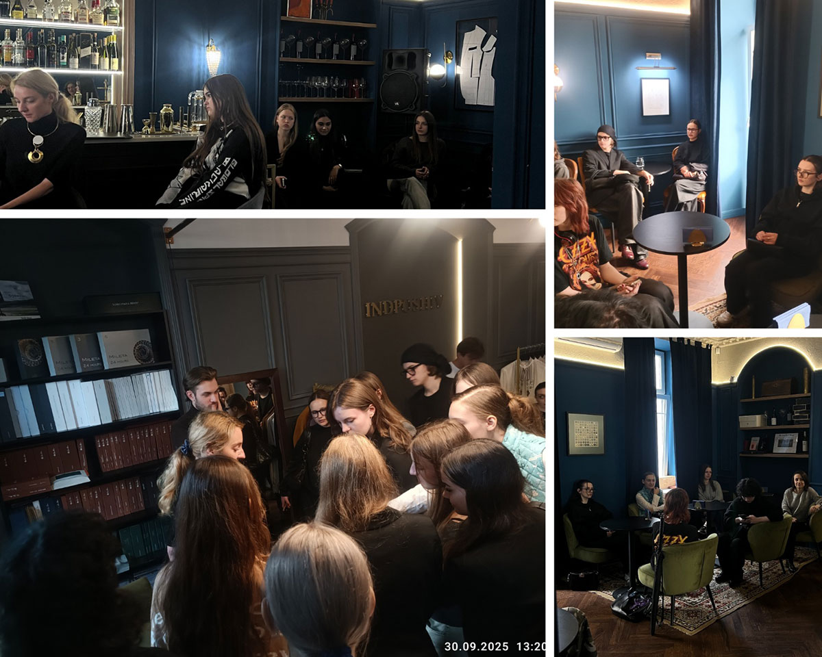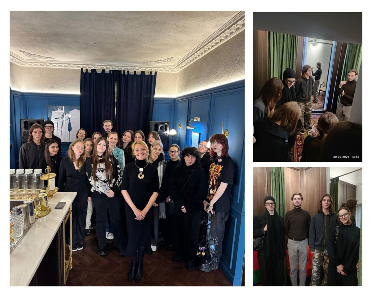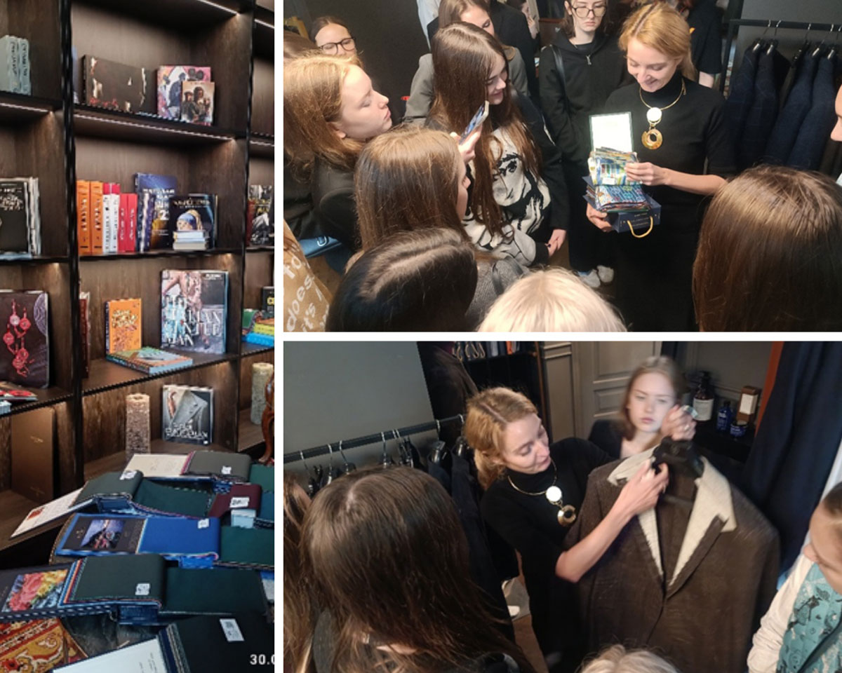 The founder and creative inspirer of “INDPOSHIV Bespoke House”, Kateryna Vozianova, met with the students and spoke about the early stages of creating her own brand, the philosophy of bespoke clothing, and working with clients — well-known personalities from different countries around the world. She also described the company’s workflow and highlighted the distinctive features of classic men’s fashion in Ukraine. The brand’s owner gave the students a tour of the Fashion House, showing them exclusive fabric and accessory catalogs, fitting rooms, and the production facilities.