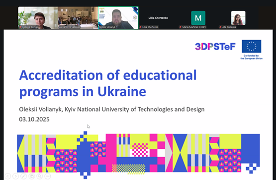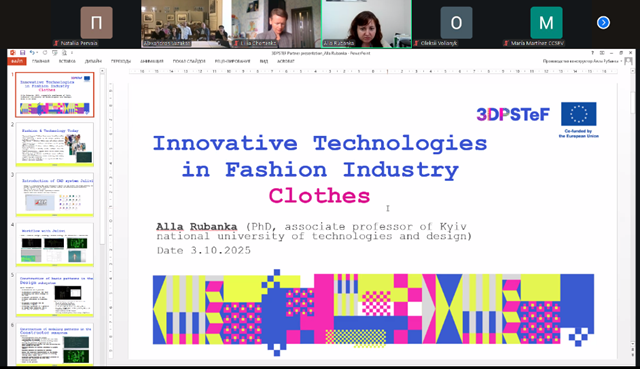 On October 2-3, 2025, academic staff of Kyiv National University of Technologies and Design actively participated in the kick-off meeting of the international project 3DP-STeF “3D Printing for Sustainable Textile and Fashion Education”, which took place online at the Technical University of Crete (Chania, Greece).