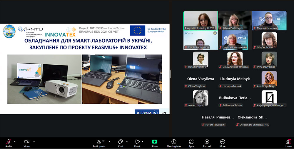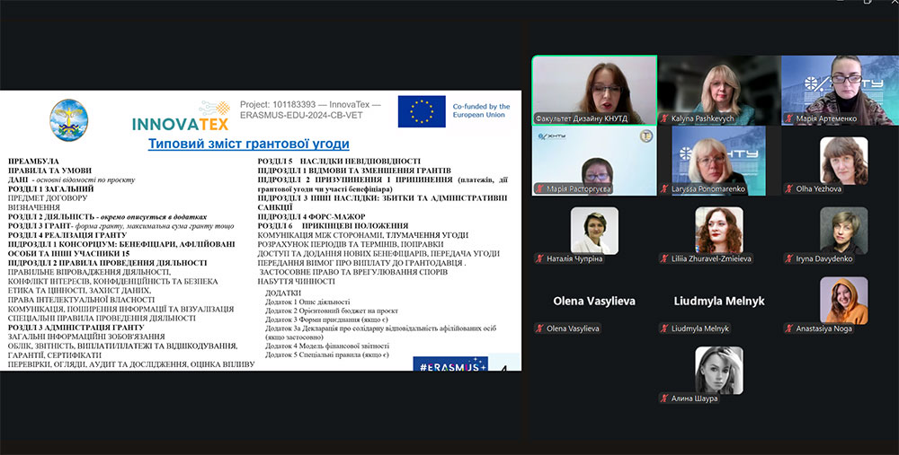 During the meeting, the participants discussed the main areas of the EU Erasmus+ Program. The moderators of the meeting spoke about the application process and the progress of the Erasmus+ project 101183393 — InnovaTex — ERASMUS-EDU-2024-CB-VET “Innovations in the field of smart and digital skills in vocational education for the modern textile industry”, which is implemented by scientists of the Faculty of Design within the framework of the KA2 direction “Collaboration projects”.