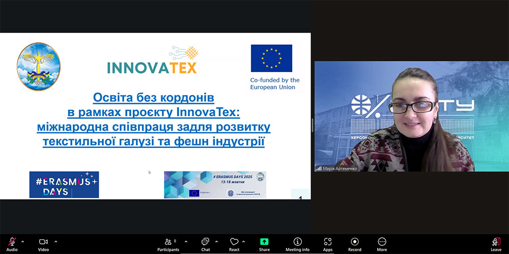 On October 16, 2025, the Kyiv National University of Technology and Design hosted a webinar "Education without Borders within the InnovaTex Project: International Cooperation for the Development of the Textile and Fashion Industry", which became part of the international initiative #ErasmusDays2025, which is implemented with the support of the Erasmus+ Office of the European Commission and the Erasmus+ National Agencies in the participating countries.
