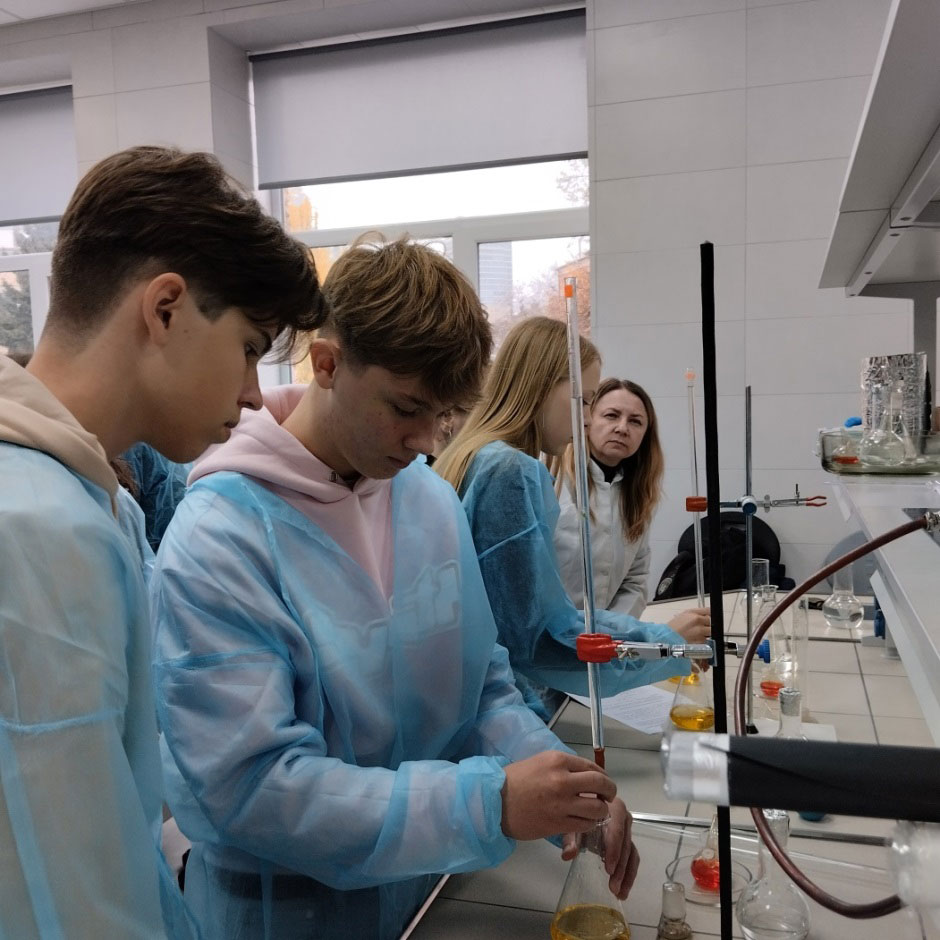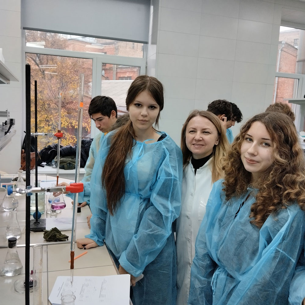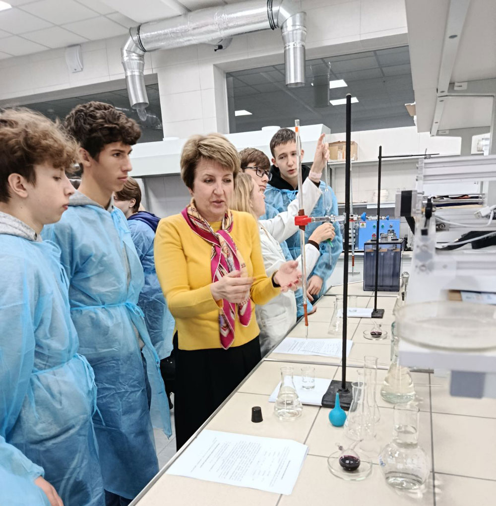Chemistry lessons for high school students of Lyceum No. 240 “Socium” are conducted by teachers from the Faculty of Chemical and Biopharmaceutical Technologies, together with Chemistry teacher Raisa SERGUNINA have become traditional. The topic of the lesson this time was “Determining the Hardness of Drinking Water”. Under the guidance of Prof. Viktoriia PLAVAN and PhD, Senior Lecturer of the Department Oksana BUTENKO, the students became familiar with the rules of working in a chemical laboratory, learned what water hardness is and which methods can be used to determine it. They also practiced titrating samples of the analyzed water on their own and performed the corresponding calculations based on the results obtained.