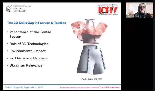 The online presentation by Dr. Evridiki Papachristou, a foreign colleague and partner of the University, PhD of the Department of Creative Design of the International Hellenic University, Greece, was fascinating and spectacular. She focused on the role of modern education in integrating creative approaches and innovations in the training of new generation designers. The researcher emphasized the importance of international cooperation between educational institutions in Europe and Ukraine for the exchange of experience and the implementation of advanced educational practices. She presented the concept of developing creative thinking as a key competency in design education and emphasized the importance of an interdisciplinary approach in curricula. Evridiki also noted that modern fashion is not only an aesthetic but also a cultural phenomenon capable of shaping the values of sustainable development and intercultural dialogue. Her presentation aroused lively interest among the participants and became a vivid example of the European vision of the future of design education.