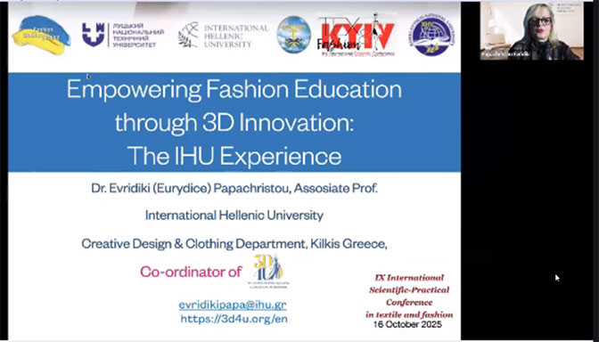The online presentation by Dr. Evridiki Papachristou, a foreign colleague and partner of the University, PhD of the Department of Creative Design of the International Hellenic University, Greece, was fascinating and spectacular. She focused on the role of modern education in integrating creative approaches and innovations in the training of new generation designers. The researcher emphasized the importance of international cooperation between educational institutions in Europe and Ukraine for the exchange of experience and the implementation of advanced educational practices. She presented the concept of developing creative thinking as a key competency in design education and emphasized the importance of an interdisciplinary approach in curricula. Evridiki also noted that modern fashion is not only an aesthetic but also a cultural phenomenon capable of shaping the values of sustainable development and intercultural dialogue. Her presentation aroused lively interest among the participants and became a vivid example of the European vision of the future of design education.
