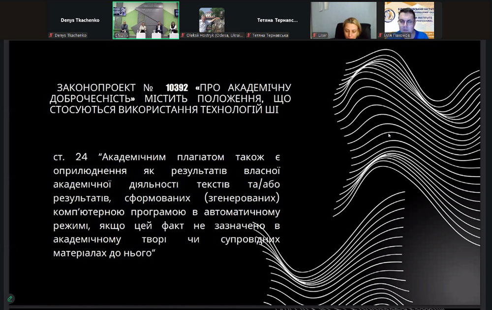 Graduate students of the Faculty of Design Pavlo Horny, Denys Tkachenko, Vyacheslav Moskal, Margarita Ivanova, Hanna Hryhorchuk, Anastasiia Yukhymchuk, Nadiia Lyuklyan and others listened to reports on the topics: "Normative aspect of the use of AI in education and science"; "Artificial intelligence in scientific research: between innovation and responsibility"; "AI in scientific works: how direct use is detected and assessed"; "Practical tools based on AI for researchers."
