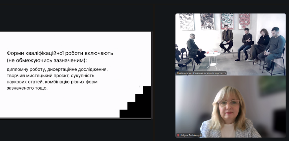 Kalyna Pashkevych, as the head of the subcommittee for the specialty B2 "Design" of the National Committee of the Ministry of Education and Science of Ukraine, spoke during the discussion about the status of the development of a new standard for the specialty "Design", about the work of the subcommittee members, and about the next stages of developing the standard.