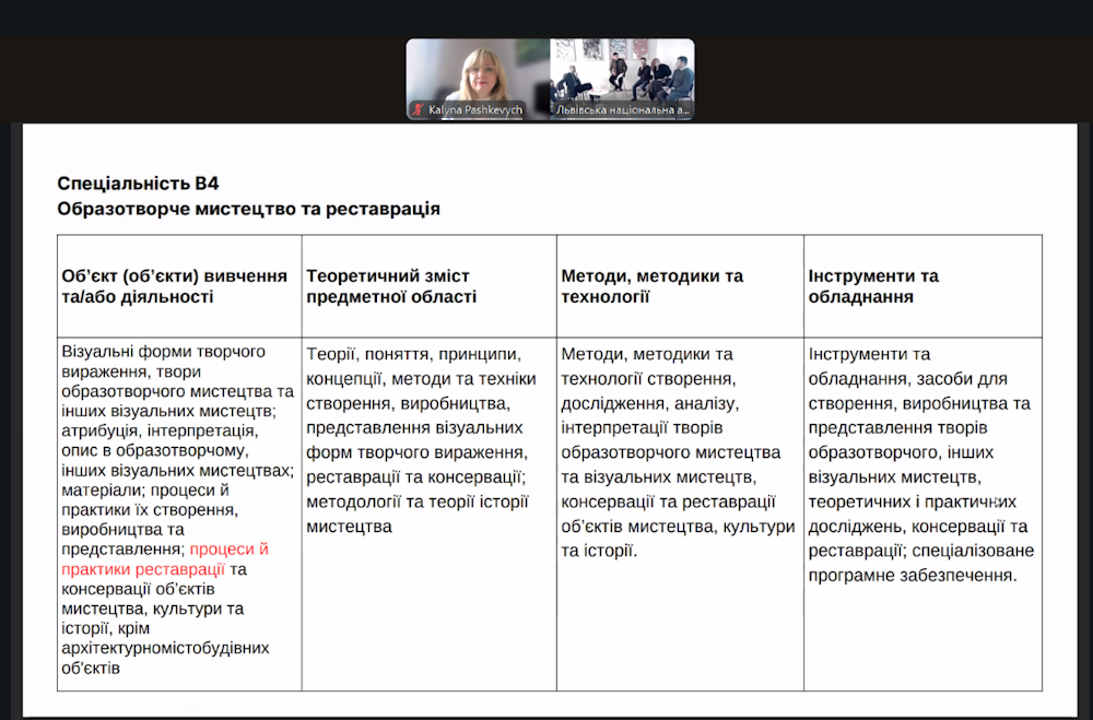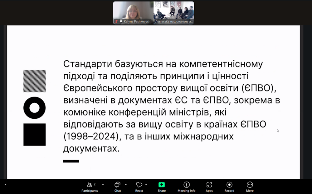 The participants of the discussion discussed how the development and implementation of standards will affect the content and methods of teaching in art institutions, as well as the extent to which these documents at the current project stage correspond to international framework guidelines and trends in the European Higher Education Area.