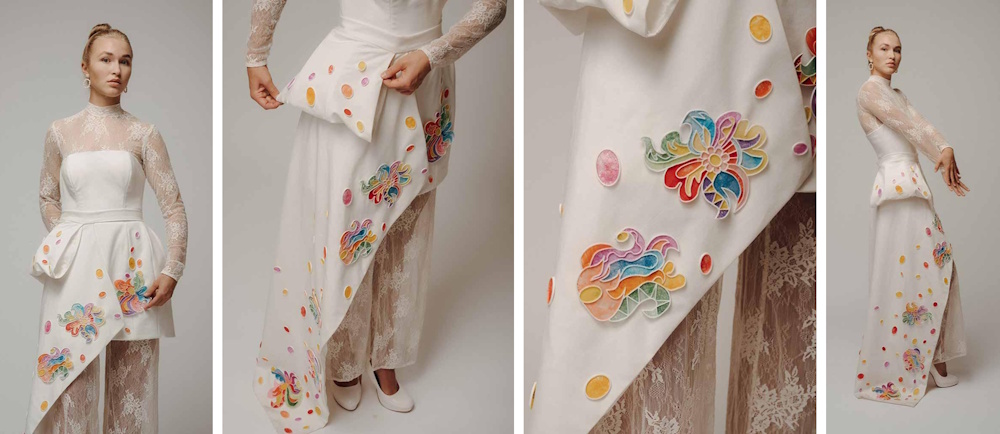 The model by Anastasia Stelmakh with stylized elements of Samchykivka painting – a unique phenomenon of Ukrainian decorative art, almost destroyed in the 1930s during the “Shot at the Renaissance” is an act of cultural resistance, a living symbol of memory, hope, and indestructible Ukrainian identity. The work reinterprets the traditional visual language of Samchykivka, transforming the historical ornament into a modern, fashionable aesthetic.