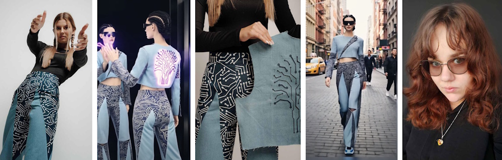 The suit is designed on the principle of modularity, which is implemented using fittings and provides a functional transformation of the product, making it adaptive, aesthetically ergonomic, and environmentally friendly. To implement the idea, the designer combined denim, laser cutting, and thermal transfer printing. The precision of the laser enabled the creation of structural technical elements and printing of color gradients similar to energy flows.