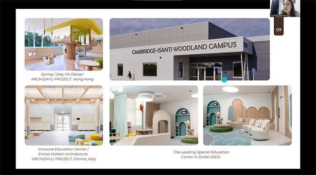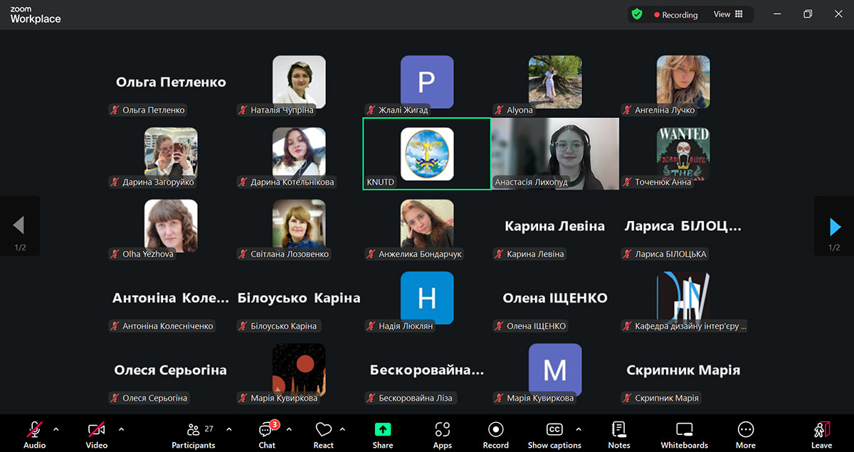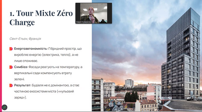 During the meeting, a number of research works by students of the Faculty of Design of KNUTD were demonstrated, dedicated to the current issues of interior design and the urban environment. In particular, under the leadership of Shmelova-Nesterenko O., Doctor of Philosophy, Associate Professor of the Department of Interior and Furniture Design of KNUTD, the works of Kotelnikova D. were performed and presented, which highlighted modern trends and features of the design of the interiors of inclusive resource centers, and Levina K. on the integration of art space into an abandoned metro station. A report by Petrosian D. was also heard, who, together with Bulhakova T., Candidate of Technical Sciences, Associate Professor of the Department of Interior and Furniture Design of KNUTD, investigated the use of biophilic design in the interior of psychological assistance centers. Student Kuvyrkova M. (supervisor Ahliullin R., Doctor of Philosophy, Associate Professor of the Department of Interior and Furniture Design, KNUTD) revealed the meaning of the principle of "zero intervention" in the context of post-war urban reconstruction.
