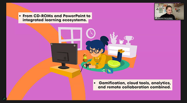 The Faculty of Culture and Creative Industries presented student reports under the leadership of Vyshnevska M., Associate Professor of the Department of Philology and Translation of KNUTD. The works of students Zahoruyko D. on interactive presentations and multimedia platforms as tools for increasing student engagement in the digital educational environment, and Beskorovayna Ye. on the use of artificial intelligence in idea generation and overcoming creative blocks were completed and presented.