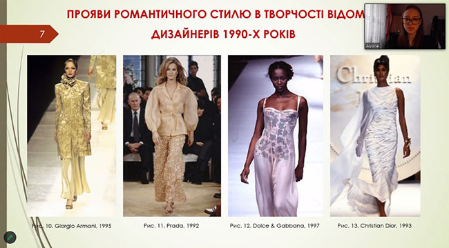 A student of the Department of Art and Fashion Design of the Faculty of Design, Kravchenko A. (supervisors: Pashkevych K., Doctor Engineering, Professor of the Department of Art and Fashion Design, Dean of the Faculty of Design of the KNUTD, Gerasymenko O., Doctor of Philosophy, Associate Professor of the Department of Art and Fashion Design) presented a work that highlights the evolution and modern trends of the romantic style in clothing design.