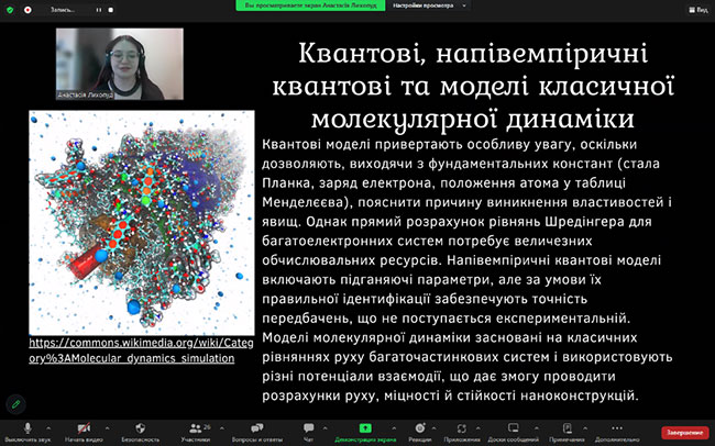 Students of the Faculty of Engineering and Information Technologies demonstrated a high level of professional training, presenting complex and relevant scientific works in the field of computer technologies and applied mathematics. The following were presented to the attention of those present: a report by students Zhlali Zh. and Zhola E. (supervisor Manoilenko O., Candidate of Sciences in Engineering, Associate Professor of the Department of Mechanical Engineering of KNUTD), dedicated to machine vision and the formation of computer "perception of the world", as well as the work of Likhopud A. (supervisor Volokh L., PhD in Physics and Mathematics, Associate Professor of the Department of Applied Physics and Higher Mathematics) in which mathematical methods in nanotechnology are investigated.