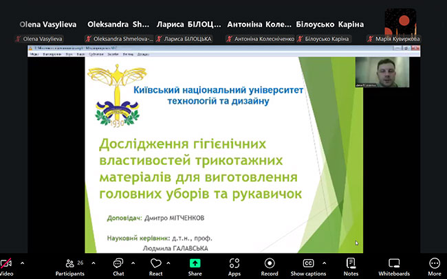 Interesting and informative reports of students and postgraduates of the Faculty of Arts and Fashion were heard. Student Luchko A. (supervisors: Lozovenko S., Assistant Professor of the Department of Fashion and Style of KNUTD, Bilotska L., Doctor of Philosophy, Associate Professor of the Department of Fashion and Style of KNUTD) investigated the relevance of the upcycling strategy and its impact on the transformation of the fashion industry and consumer culture. Postgraduate student Mitchenkov D. in co-authorship with Galavska L.E., Doctor of Technical Sciences, Professor, Head of the Research Department of KNUTD and Kharchenko Y., Senior Researcher of the ARTL "Textile-TEST", presented the results of the analysis of the hygienic properties of knitted materials for the manufacture of hats and gloves.