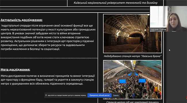 During the meeting, a number of research works by students of the Faculty of Design of KNUTD were demonstrated, dedicated to the current issues of interior design and the urban environment. In particular, under the leadership of Shmelova-Nesterenko O., Doctor of Philosophy, Associate Professor of the Department of Interior and Furniture Design of KNUTD, the works of Kotelnikova D. were performed and presented, which highlighted modern trends and features of the design of the interiors of inclusive resource centers, and Levina K. on the integration of art space into an abandoned metro station. A report by Petrosian D. was also heard, who, together with Bulhakova T., Candidate of Technical Sciences, Associate Professor of the Department of Interior and Furniture Design of KNUTD, investigated the use of biophilic design in the interior of psychological assistance centers. Student Kuvyrkova M. (supervisor Ahliullin R., Doctor of Philosophy, Associate Professor of the Department of Interior and Furniture Design, KNUTD) revealed the meaning of the principle of "zero intervention" in the context of post-war urban reconstruction.
