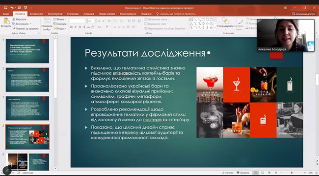 In addition, student works on graphic, industrial and multimedia design, as well as educational technologies, were presented. Among them: a report by Bondarchuk A. (supervisor Zhuravel-Zmieieva L., Doctor of Philosophy, Head of the Department of Graphic Design of KNUTD) dedicated to the introduction of thematic stylistics into graphic design and the formation of the corporate style of cocktail bars in Ukraine; a work by Petlenko O. (supervisor Yezhova O., Doctor of Pedagogical Sciences, Candidate of Technical Sciences, Professor of the Department of Graphic Design of KNUTD), which explored the aesthetics of pastel-kawaii in the design of surprise toys; and a report by Tocheniuk A. (supervisor Vasylieva O., Candidate of Technical Sciences, Head of the Department of Multimedia Design of KNUTD), which reveals the features of the transformation of the artistic image in the design of video games.