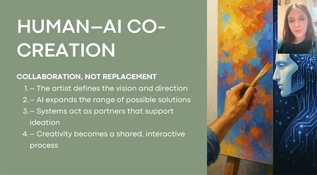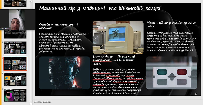 The Faculty of Culture and Creative Industries presented student reports under the leadership of Vyshnevska M., Associate Professor of the Department of Philology and Translation of KNUTD. The works of students Zahoruyko D. on interactive presentations and multimedia platforms as tools for increasing student engagement in the digital educational environment, and Beskorovayna Ye. on the use of artificial intelligence in idea generation and overcoming creative blocks were completed and presented.