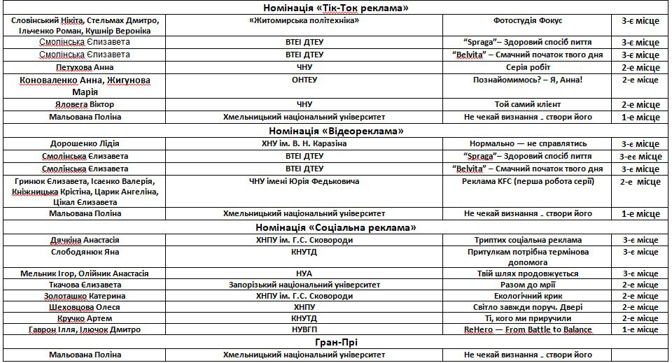 Higher education graduates of the Marketing Department of the Kyiv National University of Technologies and Design worthily represented the university, winning prizes and confirming the high level of professional training of graduates of the D5 "Marketing" specialty. The competition program included the best advertising works of students from different regions of Ukraine - Kyiv, Lviv, Odessa, Kharkiv, Dnipro, Poltava, Chernivtsi, Ternopil, Rivne, Vinnytsia and other cities. Participants also had the opportunity to join a series of professional master classes from leading industry experts, namely: