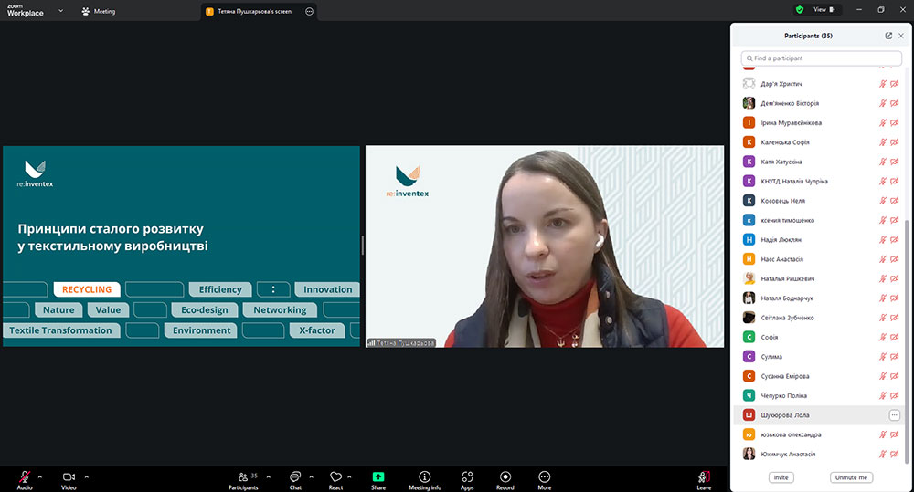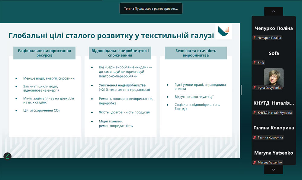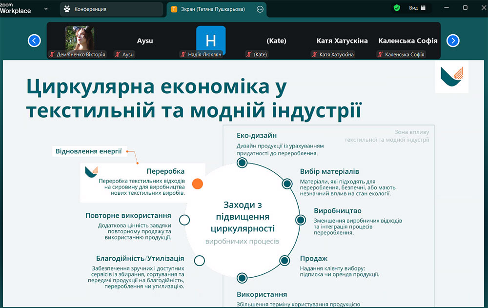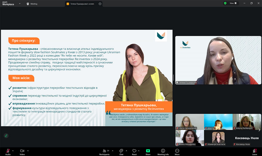 Tetiana Pushkarova shared her own experience in the fashion industry and the possibilities of combining craftsmanship with modern principles of sustainable development, presenting fashion through the prism of responsible design and circular economy. The speaker introduced the requirements for eco-design, directions of textile processing, the main legislative acts aimed at preventing the formation of textile waste, expanding the manufacturer's responsibility for products throughout their life cycle, and emphasized the importance of the design stage of textile products for their further recycling.