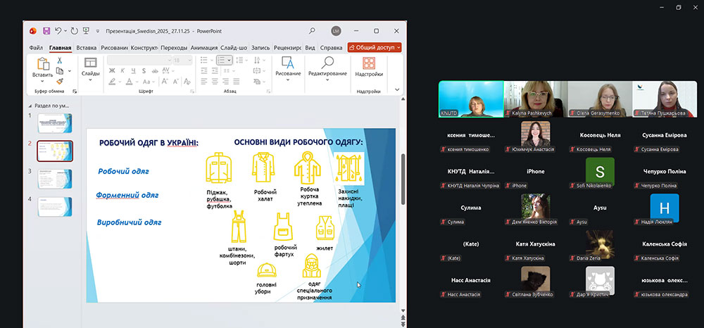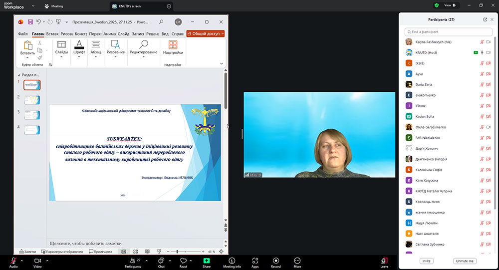 The event was moderated by Liudmyla Melnyk, Candidate of Technical Sciences, Associate Professor, Associate Professor of the Department of Art and Fashion Design, Coordinator of the SusWearTex project. Students of the Department of Art and Fashion Design, postgraduate students of the Design Faculty, teachers of the Department of Art and Fashion Design, as well as executors of the SusWearTex scientific project took an active part in the seminar. At the beginning of the event, Liudmyla Melnyk presented the main stages and goals of the project "SusWearTex: Baltic Neighbourhood Cooperation in Sustainable Workwear Initiatives - Driving Recycled Fiber Excellence in Workwear Textiles".