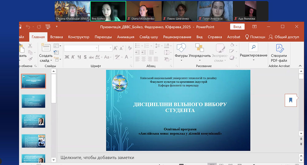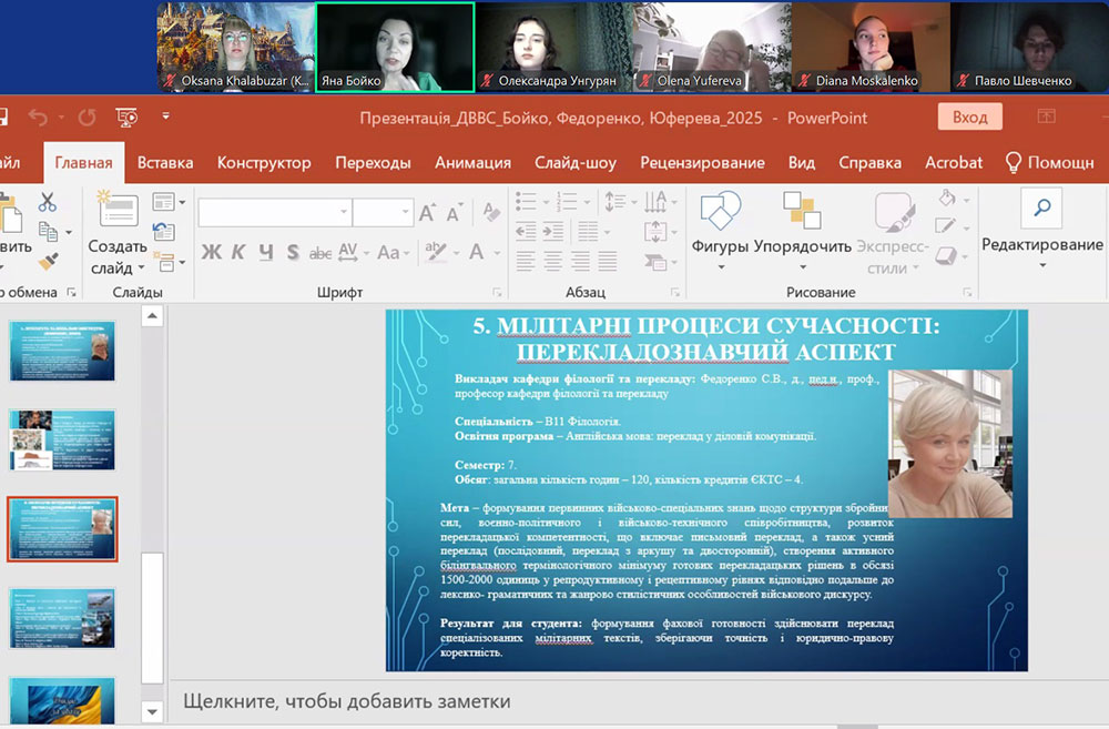 Department alumni Pavlo Shevchenko, Taisiia Lunha, and Yelyzaveta Myroshnychenko shared their practical experience of applying the competencies acquired during their studies in professional contexts. In their presentations, they outlined key requirements of the contemporary labour market, including the need to combine strong linguistic training with proficiency in digital tools, intercultural communication skills, flexibility, and the ability to adapt quickly to professional challenges.