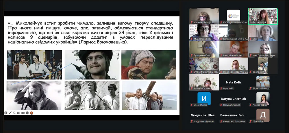 The lecturer emphasised the influence of the artist's family and ethnocultural environment, talked about his studies at the Kyiv Institute of Theatre Arts, his first works in the theatre, and his film debut with Leonid Osyka. Special attention was paid to the formation of Mykolaichuk's authorial style, which combines authenticity, metaphoricality, musicality, and psychological depth.
