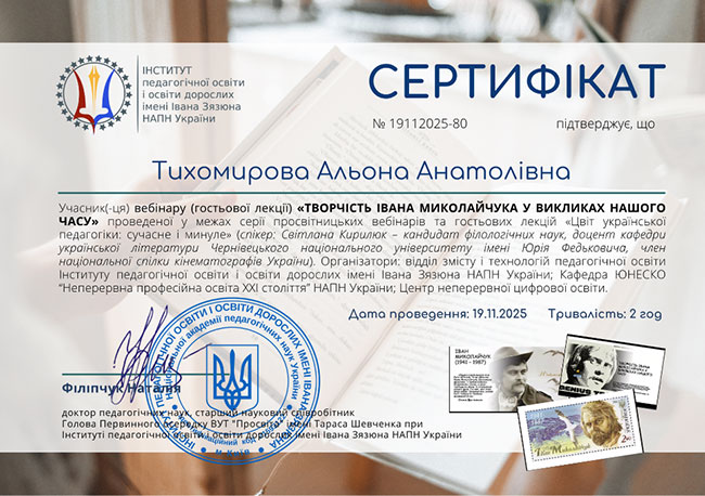 On 19 November 2025, a webinar entitled ‘The Creativity of Ivan Mykolaychuk in the Challenges of Our Time’ was held. It was the fourteenth event in a series of educational webinars and online guest lectures entitled ‘The Flower of Ukrainian Pedagogy: Present and Past.’