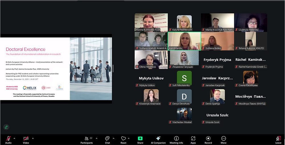 During the meeting, Professor Joanna Kurowska-Pysz (WSB Academy) gave a presentation on the topic “Doctoral Excellence – the foundation of international collaboration in research” and spoke about the scientific activities carried out within the Q-Helix Alliance with the support of the Polish National Agency for Academic Exchange (NAWA), as well as about the training schools. Joanna Kurowska-Pysz also told the postgraduate students about the need to develop and visualize their “young scientist” brand. The lecture was filled with examples and practical advice for young scientists regarding their “behavior” in the international scientific environment in order to make them recognizable and interested in cooperation.