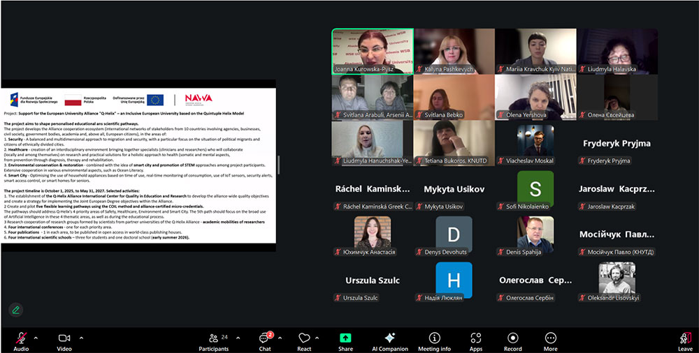 On December 11, 2025, a meeting of the executors of the international project of the university was held, consisting of: Vice-Rector for Research and International Cooperation Liudmyla Hanushchak-Efimenko, Head of the International Institute of Postgraduate and Doctoral Studies Svitlana Arabuli, Head of the Research Department Liudmyla Halavska, Head of the Information Support and Technology Transfer Department Olena Yershova, Director of the Scientific and Technical Library Tetiana Bukoros, Head of the Marketing Department Olena Ievseitseva, Professor of the Marketing Department Svitlana Bebko, Associate Professor of the Department of Fashion and Style Arsenii Arabuli with European partners within the framework of the international Q-Helix Alliance under the European Universities Support Program "Scientific Vectors".