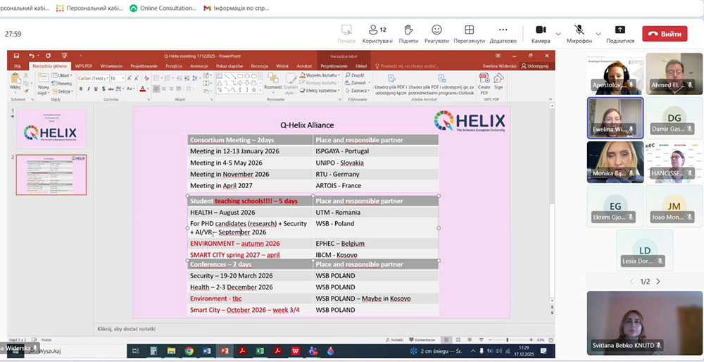 On December 17, 2025, a coordination meeting of the participants of the international project under the European Universities Support Program "Scientific Vectors" within the framework of the Q-Helix Alliance was held. The University was presented by Professor of the Department of Marketing Svitlana Bebko. During the meeting, they discussed ways to build strong ecosystems of cooperation (international networks of stakeholders from 10 countries participating in the alliance, including agencies, business, civil society, government bodies and academia) in the following areas: