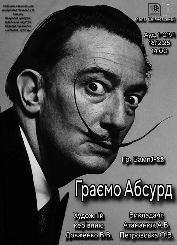 On December 16, 2025, fourth-year students (group BAMP1-22) majoring in 026 Performing Arts at the Kyiv National University of Technologies and Design presented their new creative work to the audience – a show-exam called “Let's Play Absurd.” This was an important final stage of training, dedicated to the study of extraordinary forms of theatrical expression.