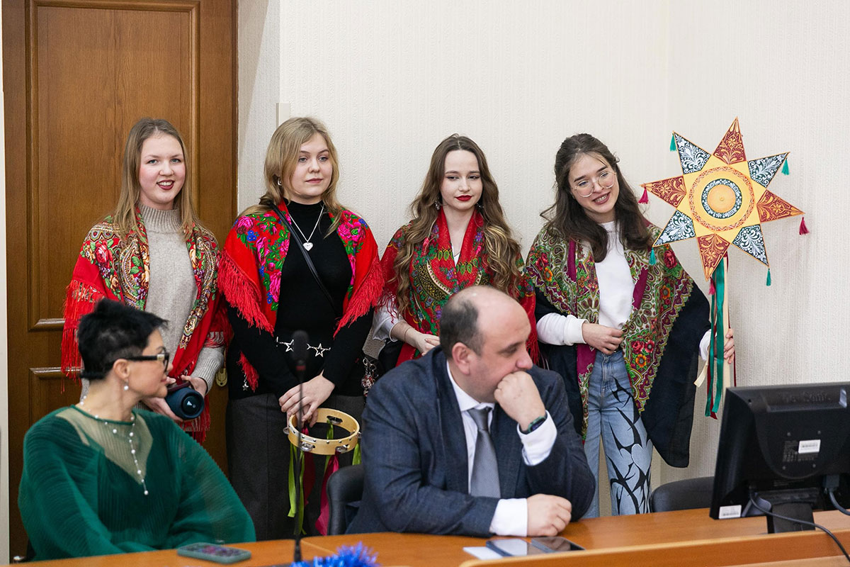 The meeting of the faculty staff was attended by scientific and pedagogical workers, heads of departments, postgraduate students, students, and auxiliary staff of departments. A bright Christmas greeting was heard from members of the student trade union committee of KNUTD. KNUTD students Anna Spaska, Anna Davydenko, Dariia Bazio and Anastasiia Mishchenko sang Christmas carols, greeting everyone present and creating a festive mood.