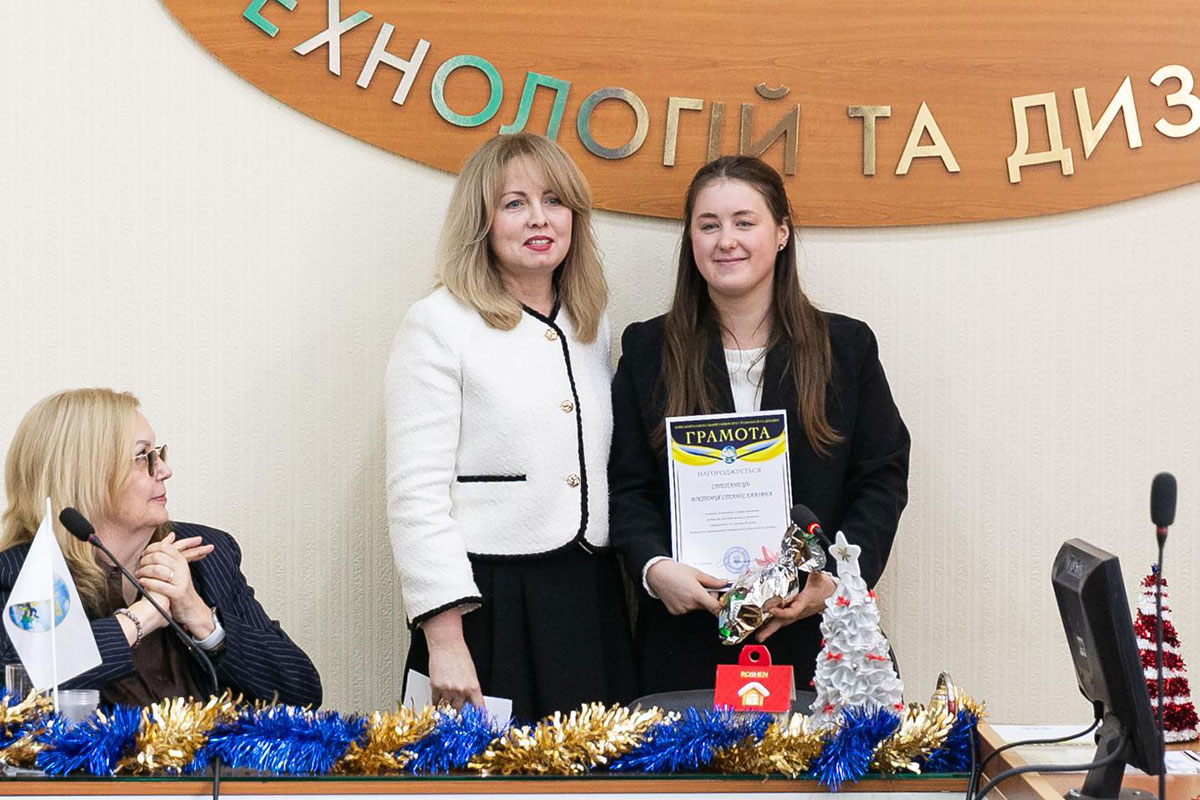 Oleksandra Olshanska, acting rector of KNUTD, Kalyna Pashkevych, dean of the Faculty of Design, and Viktoriia Stepanets, head of the student government of the Faculty of Design, awarded active students of the faculty with diplomas and sweet gifts, thanked them for their active public position, and for their assistance in organizing the educational and extracurricular activities of students of the Faculty of Design.