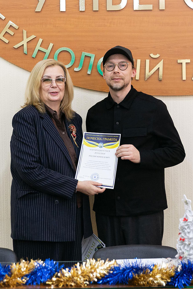Kalyna Livianivna thanked the faculty staff for their coordinated, productive work, especially noting Nataliia Chuprina, Head of the Department of Art and Fashion Design for the effective activities of the department; Olga Yezhova, Professor of the Department of Graphic Design for the large number of indexed articles in the Scopus scientometric database in 2025; Associate Professors of the Department of Art and Fashion Design Olena Gerasymenko and Liudmyla Melnyk for the implementation of the InnovaTex, SusWearTex scientific projects; Danylo Kosenko, Head of the Department of Interior and Furniture Design for the development of a number of projects for university premises to improve the material and technical base; Liliia Zhuravel-Zmieieva, Head of the Department of Graphic Design, for the active organization of exhibition activities with the broad involvement of students; Olena Vasylieva, Head of the Department of Multimedia Design and Iryna Davydenko, Associate Professor of the Department of Art and Fashion Design – for the organization of international academic online mobility of students of the faculty with universities in the USA, Great Britain, and Saudi Arabia; Galyna Kokorina, Associate Professor of the Department of Art and Fashion Design, for the organization of a large-scale exhibition of student designers “BIOFASHION” at the NR «Sofia Kyivska»; Oleksandr Vasyliev, Deputy Dean of the Faculty of Design, for organizing educational work at a high level and volunteer activities.