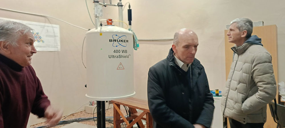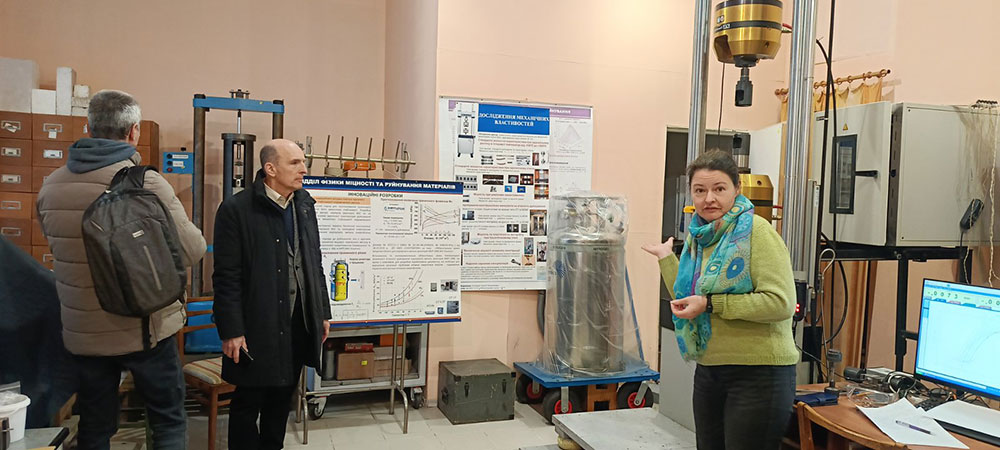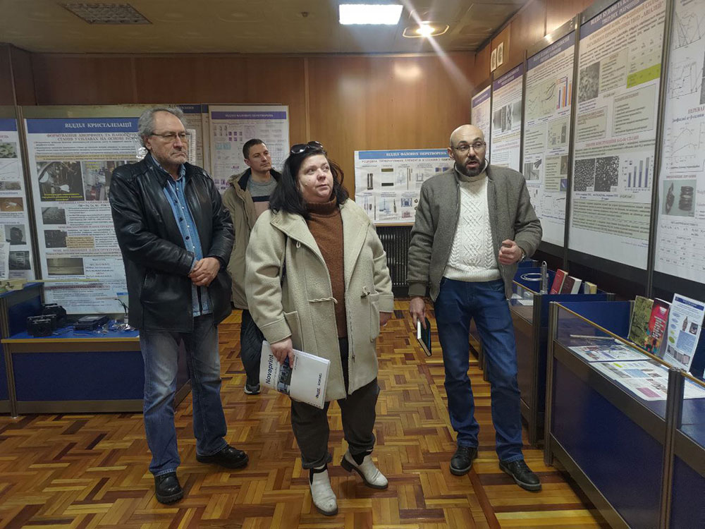 The director of the institute, academician of the National Academy of Sciences of Ukraine, Doctor of Physical and Mathematical Sciences Valentin Andriyovych Tatarenko, and his deputies, Candidate of Physical and Mathematical Sciences Vitaliy Petrovich Bevz and Doctor of Physical and Mathematical Sciences, Professor Vyacheslav Vyacheslavovich Lizunov, conducted a tour of most of the Institute's scientific laboratories, demonstrating their work. While familiarizing herself with the various laboratories, Iryna Veniaminivna Oleynikova, Head of the Department of Applied Physics and Higher Mathematics, had the opportunity to arrange for students majoring in E6 (105) Applied Physics and Nanomaterials to undergo practical training in conducting research activities related to the scientific direction of the department.