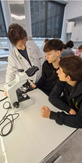 On 14 October 2025, 20 students from Lyceum № 39 in Kyiv visited the Department of Biotechnology, Leather and Fur. Head of the Department Olena MOKROUSOVA introduced the guests to the promising field of biotechnology and gave them a tour of the department's modern laboratories. Under the guidance of Associate Professor Olena OKHMAT, assistant professor Oleksandr KALINICHENKO, and laboratory head Tetiana KOLESNYK, the students participated in a master class on cell biology, which included an introduction to microscopy techniques, independent preparation of specimens for leaf epidermis research, and microscopic analysis. The students also independently completed a chemistry assignment on «Colour Reactions».