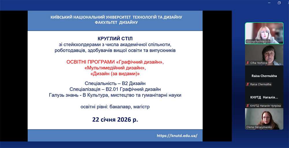 On January 22, 2026, a round table was held at the Faculty of Design of KNUTD with the participation of representatives of the academic community, employers, higher education students, and graduates. The event was dedicated to the public discussion of the educational programmes in Speciality B2 “Design”, Specialisation B2.01 “Graphic Design”, at the first (Bachelor’s) and second (Master’s) levels of higher education.