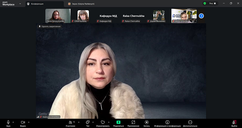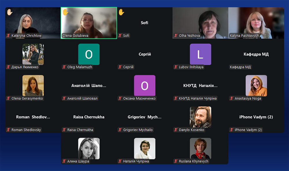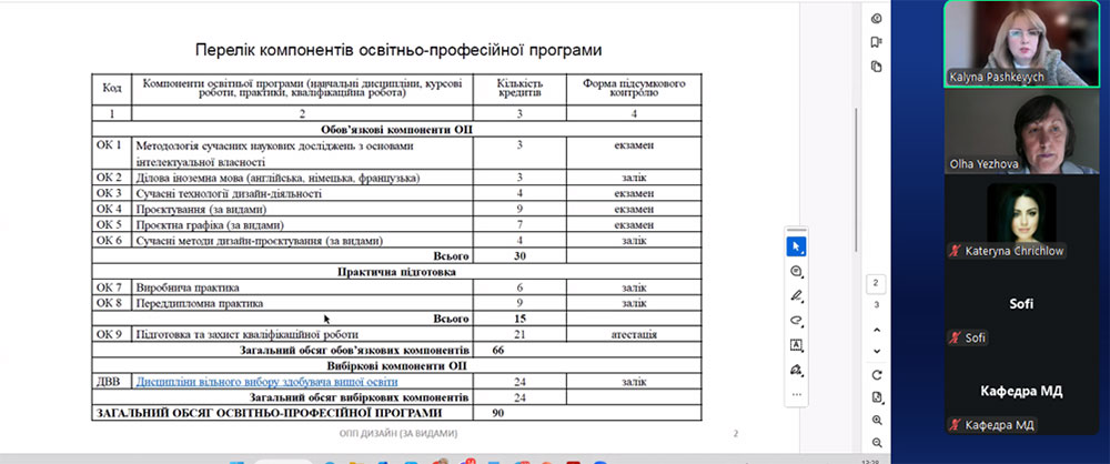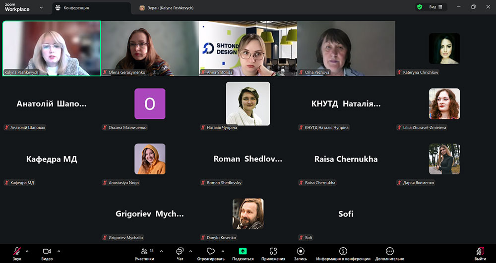 The discussion also involved academic and teaching staff of the Faculty of Design of KNUTD: Olena Gerasymenko, PhD, Associate Professor; Danylo Kosenko, Candidate of Art Studies, Associate Professor; Liliia Zhuravel-Zmieieva, PhD; Ruslana Khynevych, Candidate of Technical Sciences, Associate Professor; Alina Shaura, PhD in Pedagogy, Associate Professor; Oksana Maznichenko, Associate Professor; Liubov Ilnytska, Candidate of Philosophical Sciences, Associate Professor; Anatoly Shapoval, Associate Professor; Anastasiia Noha, Assistant Lecturer.