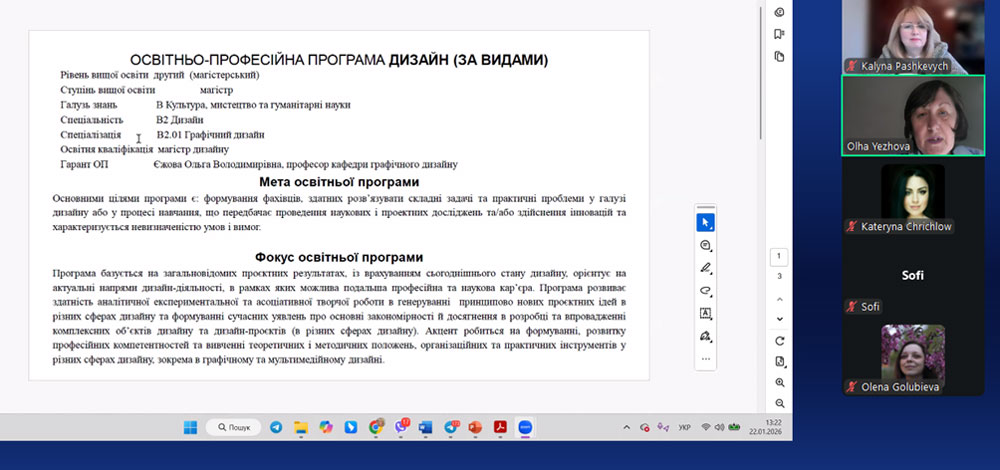 Olha Yezhova, Doctor of Pedagogical Sciences, Professor, Programme Guarantor of the Educational Programme “Design (by Types)”, presented the purpose of the programme and characterised its content. It was emphasised that the programme is aimed at training specialists capable of solving complex professional tasks and practical problems in the field of design, involving scientific and project-based research and/or innovative activities under conditions of uncertainty. It was noted that the structure and set of components of the educational and professional programme ensure the formation of the necessary competences and programme learning outcomes, as reflected in the corresponding matrices.