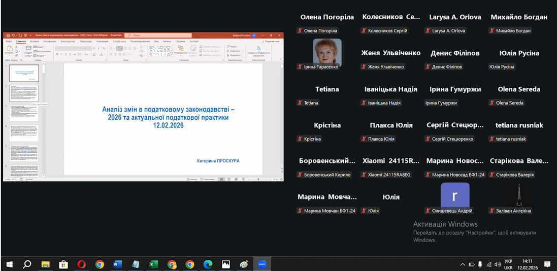 Scientific and pedagogical workers and educationalists of the Department of Finance took part in a publicity session on the topic “Analysis of changes in tax legislation and current Submission practice", which was published on February 12, 2026 in online format on the ZOOM platform. The approach is professionally and practically direct and dedicated to a comprehensive analysis of current changes in the tax legislation in 2026, as well as the current practice of its stagnation. The organizer of the visit was the Committee of Auditors of Ukraine Photo1 The closing speaker was Doctor of Economic Sciences, professor, auditor Katerina Proskura, who thoroughly revealed the problematic aspects of taxation and gave practical recommendations for introducing taxation in the minds of permanent legislative changes.