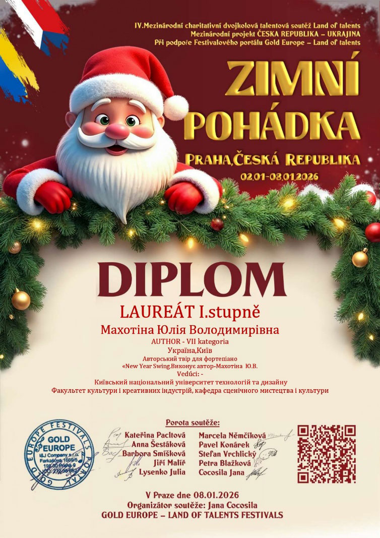 The IV International Charity Talent Contest "Zimni Pohadka" (Winter Fairy Tale) took place in Prague, Czech Republic, as part of the significant "Czech Republic – Ukraine" project. Following a professional evaluation, Yuliia Mahotina was honored with the highest award: