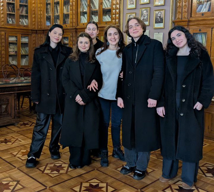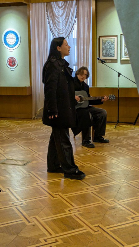 Students of Group BAMP 1-23 (under the guidance of Senior Lecturer Alla Bineieva): Oleksii Vakhliovskyi, Anna Korolova, Milana Martirosova, Anastasiia Romanenko, and Oleksandra Marysyk performed a profound program of civil lyrics, featuring works by Y. Izdryk, M. Kryvtsov, L. Kostenko, and L. Tarapakina.