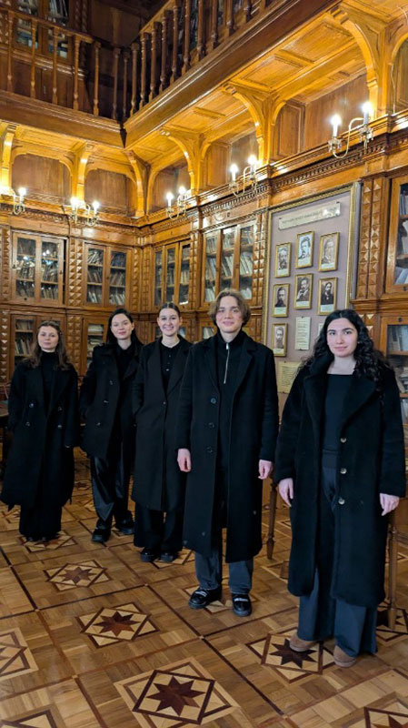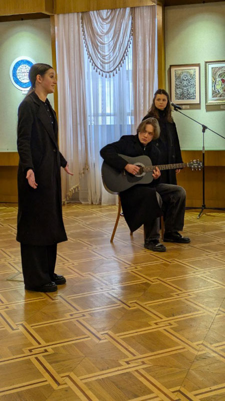 Students of Group BAMP 1-23 (under the guidance of Senior Lecturer Alla Bineieva): Oleksii Vakhliovskyi, Anna Korolova, Milana Martirosova, Anastasiia Romanenko, and Oleksandra Marysyk performed a profound program of civil lyrics, featuring works by Y. Izdryk, M. Kryvtsov, L. Kostenko, and L. Tarapakina.